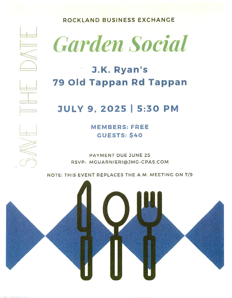 JK Ryan’s Pub and Restaurant 79 Old Tappan Rd, TappanNetworking, Food, Cash Bar and Raffles Prizes sponsored by The RBE – Rockland County’s longest tenured networking organization.